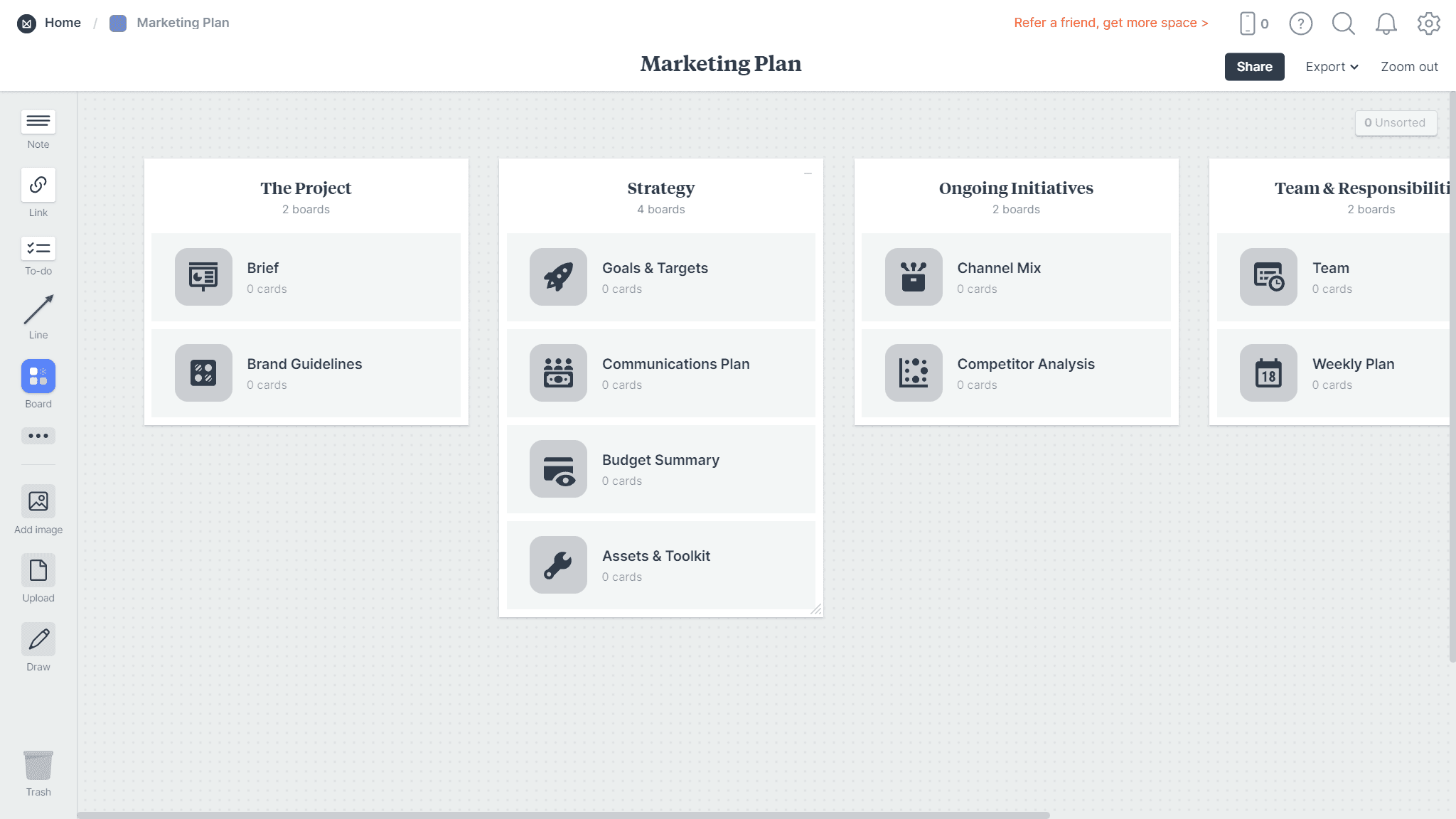 Milanote is a tool in which you can create boards that are part mood-board, part strategic-plan. It has a clean and simple interface as well as many tools for customization, which allows for flexibility in content creation. The columns, organized by subject with topic cards, are reminiscent of Trello.