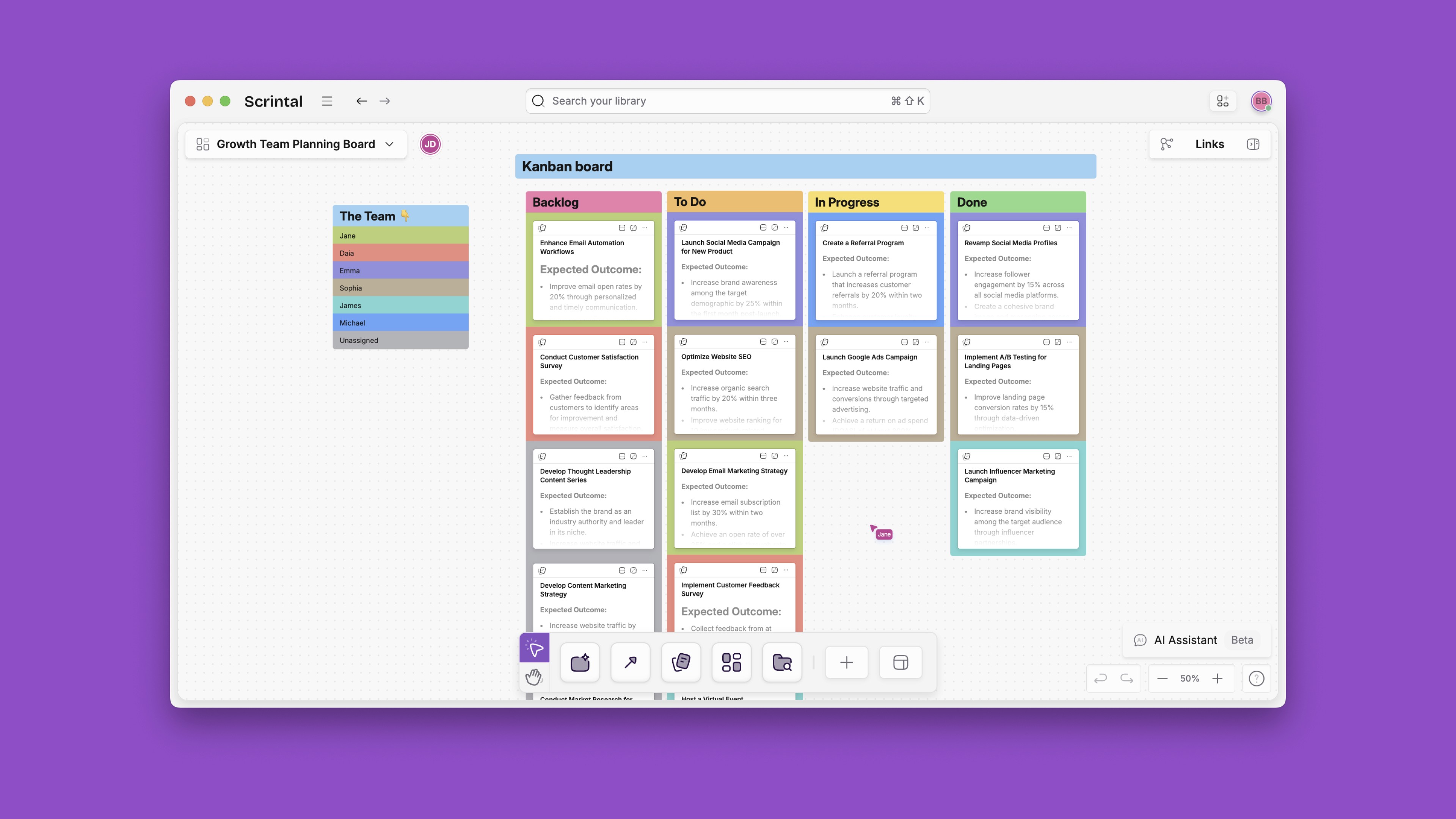 Scrintal is already working on implementing a series of integrations with other tools and expanding its tempate library based on the main use cases. It would not be realistic to expect all the features Miro has developed over the past decade in such a short time.