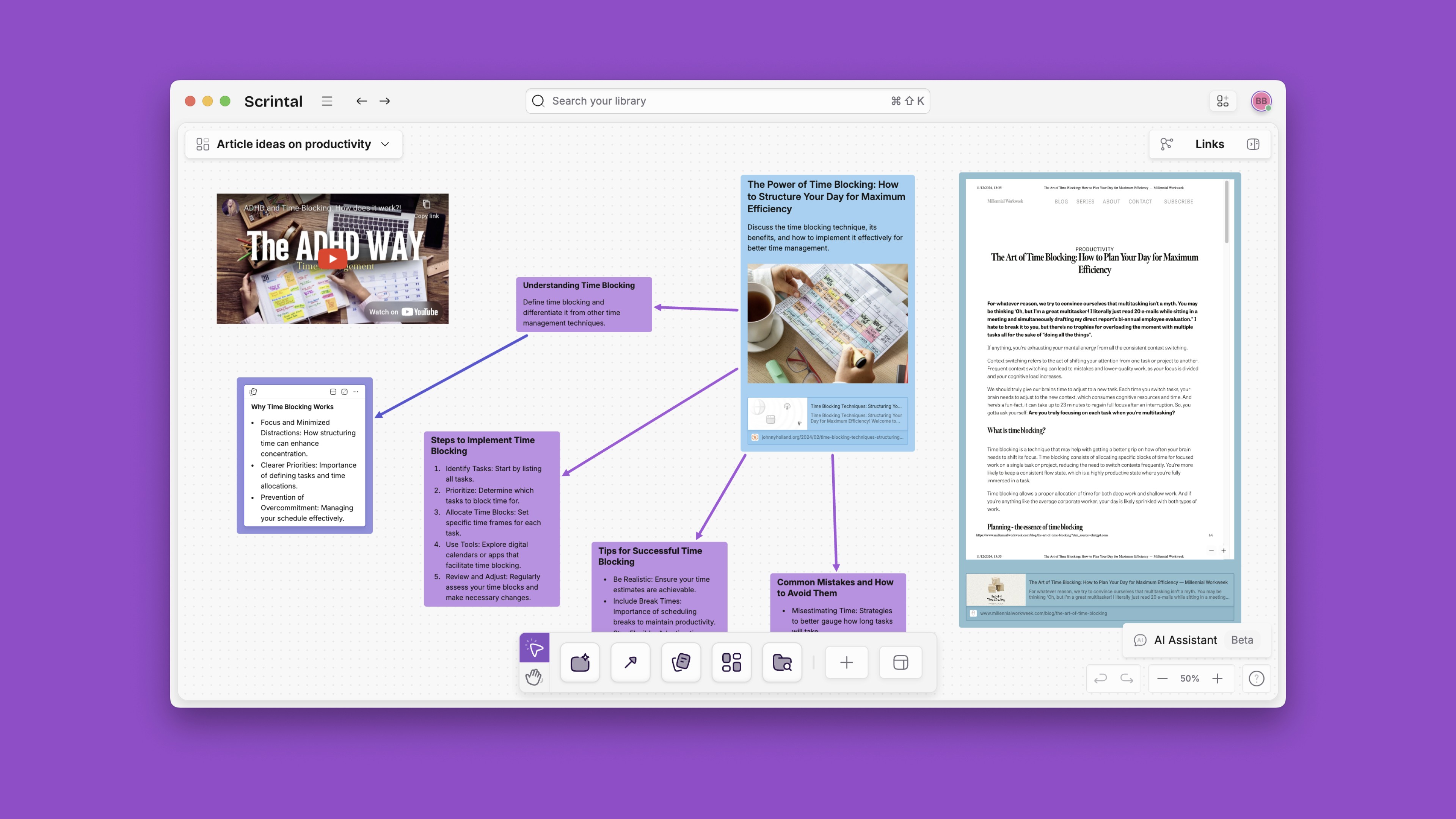 All your media are embedded by default so that you can explore them directly from your workspace. In Scrintal, you end up having an overview of your knowledge in one place. Accessing every single bit of information without leaving the app allows you to stay focused on your tasks longer.