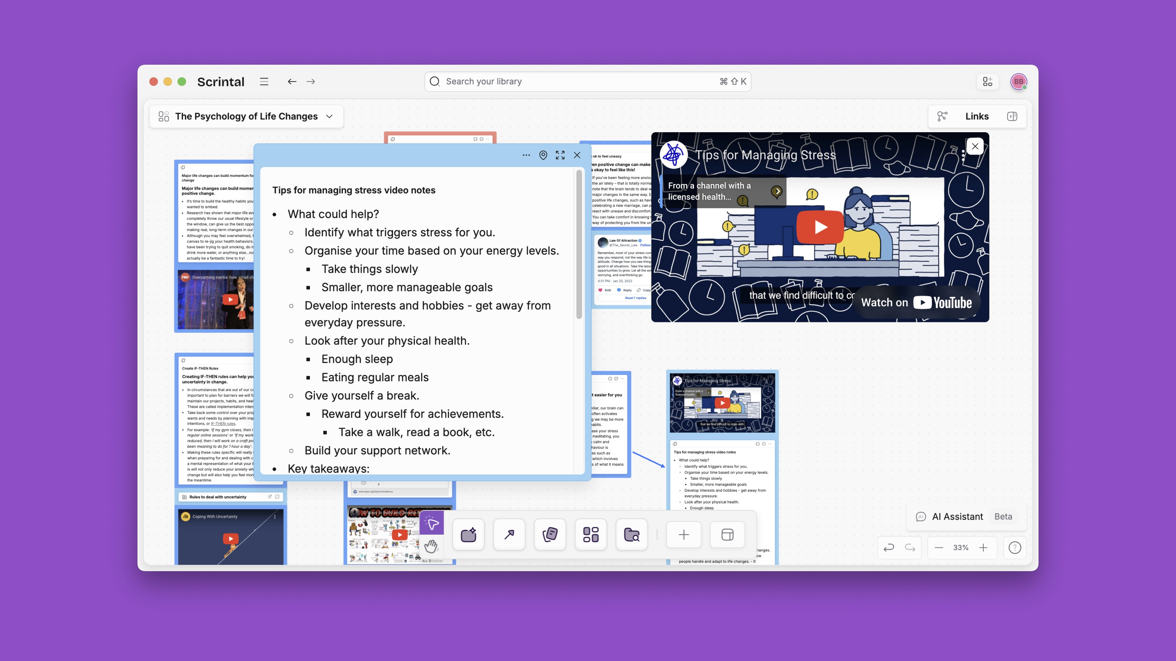 Scrintal’s virtual canvas ensures the steady flow of creativity without interruptions. Connections rise to the surface more easily in a visual format and are not at risk of being forgotten or overlooked. The Scrintal ecosystem can host videos and PDFs on the same screen as an editable note, avoiding the need to scroll up and down or switch back and forth between tabs or windows. Your research and writing can take place in the same environment.