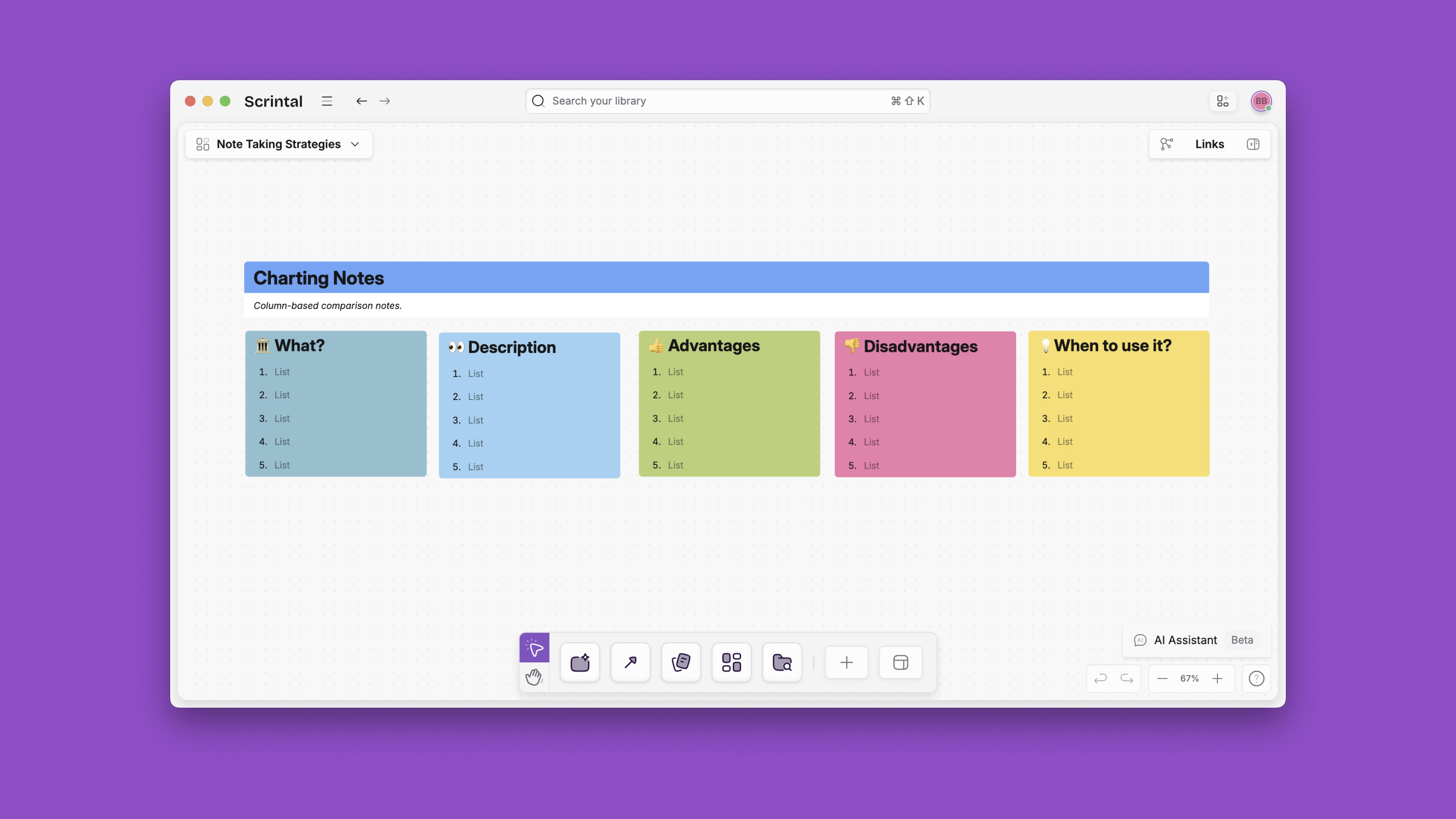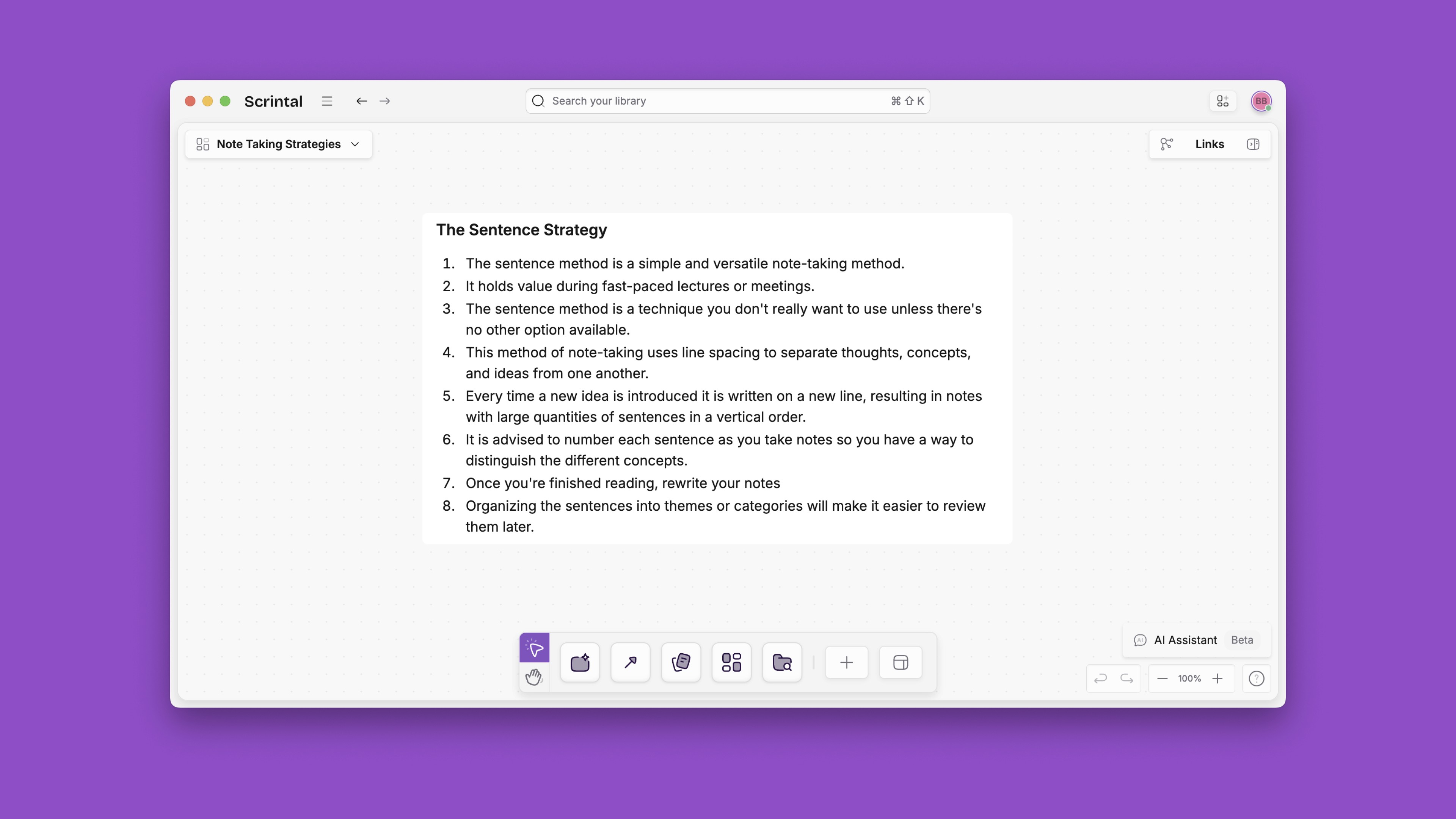 This note-taking strategy is highly visual and useful for revision, which makes it ideal for visual learners. Scrintal offers a mind mapping template that is readily available for use, as illustrated in the image above.