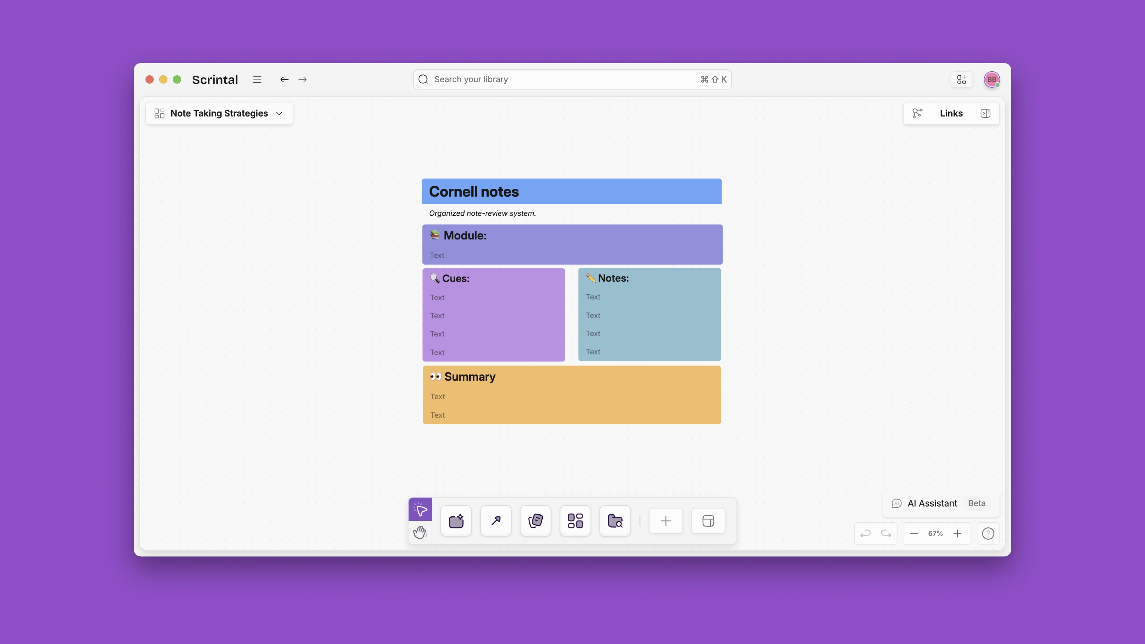 This note-taking strategy is for you if you are a logical and/or spatial learner. Scrintal has a Cornell notes template ready for use, as shown in the above image.
