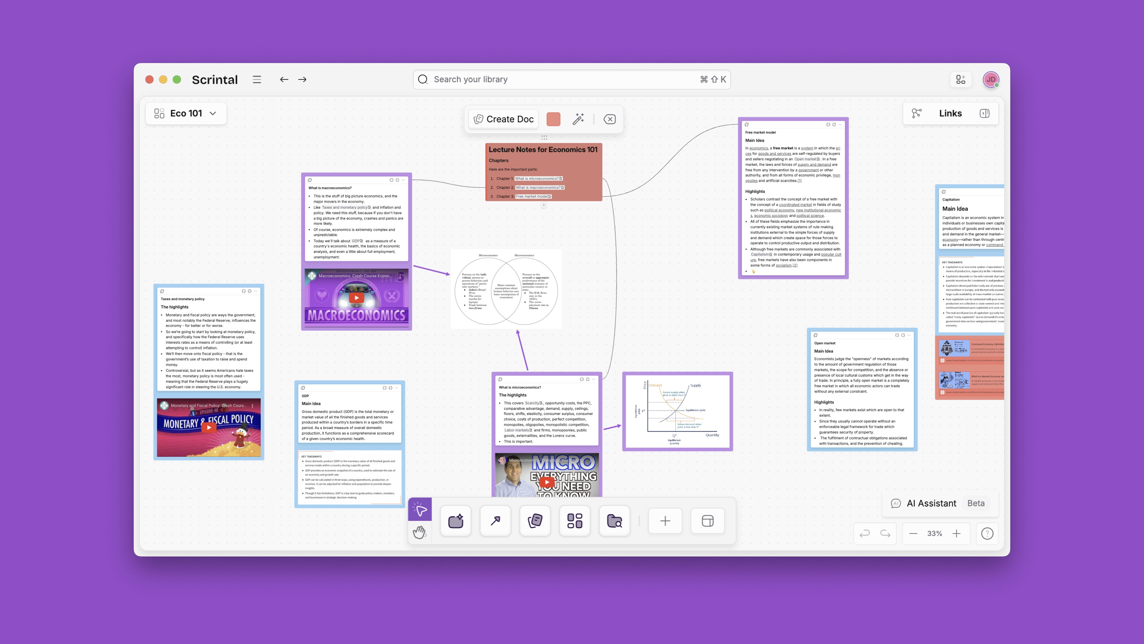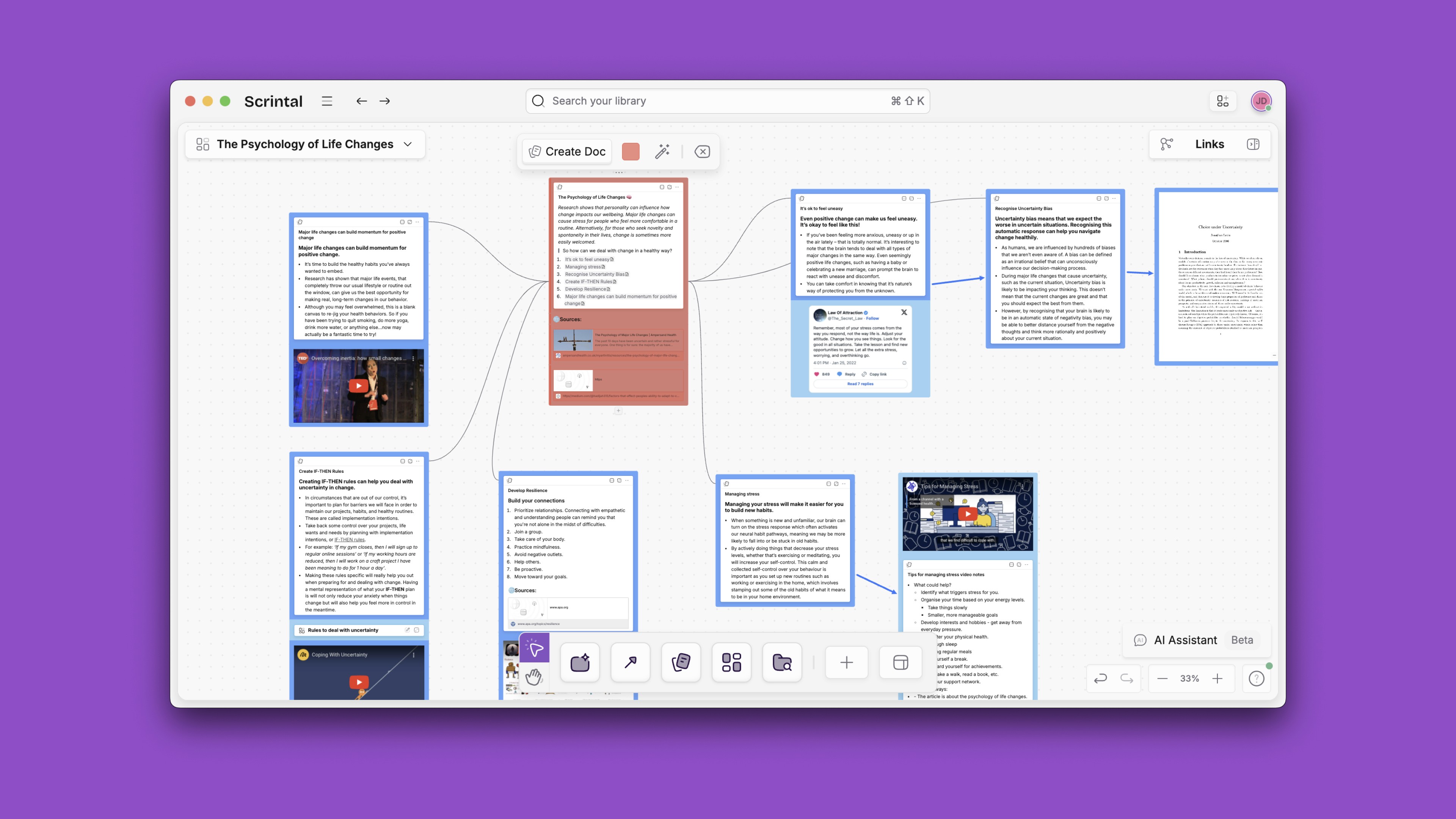 Scrintal’s virtual canvas ensures the steady flow of creativity without interruptions. Connections rise to the surface more easily in a visual format and are not at risk of being forgotten or overlooked. The Scrintal ecosystem can host videos and PDFs on the same screen as an editable note, avoiding the need to scroll up and down or switch back and forth between tabs or windows. Your research and writing can take place in the same environment.