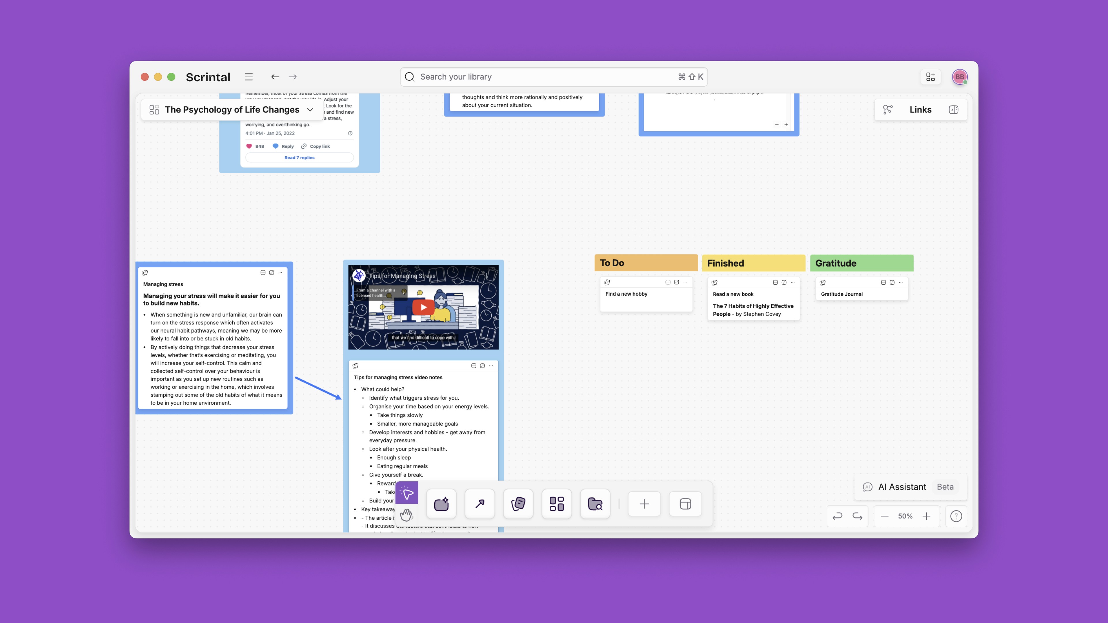 Scrintal’s virtual canvas ensures the steady flow of creativity without interruptions. Connections rise to the surface more easily in a visual format and are not at risk of being forgotten or overlooked. The Scrintal ecosystem can host videos and PDFs on the same screen as an editable note, avoiding the need to scroll up and down or switch back and forth between tabs or windows. Your research and writing can take place in the same environment.