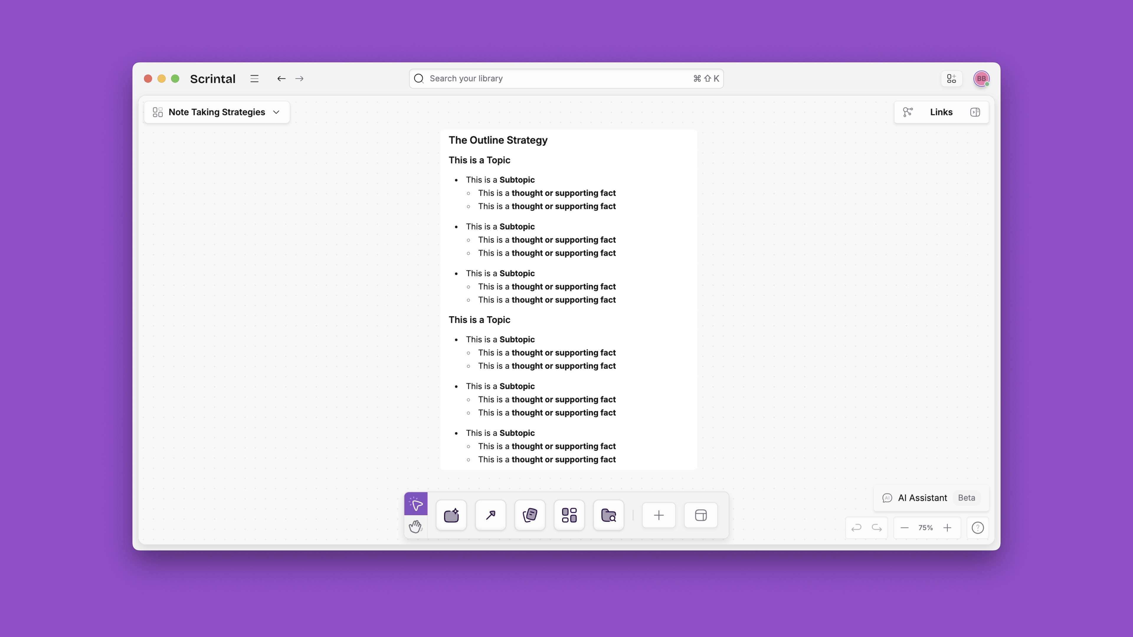 This note-taking strategy is highly visual and useful for revision, which makes it ideal for visual learners. Scrintal offers a mind mapping template that is readily available for use, as illustrated in the image above.